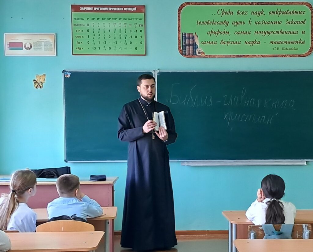 21 октября 2025 г. в ГУО «Средняя школа №2 г. Дрогичина» прошла встреча священника храма прп. Евфросинии Полоцкой в г. Дрогичине иерея Димитрия Гречко с учениками 5 класса на тему «Библия — главная книга христиан».