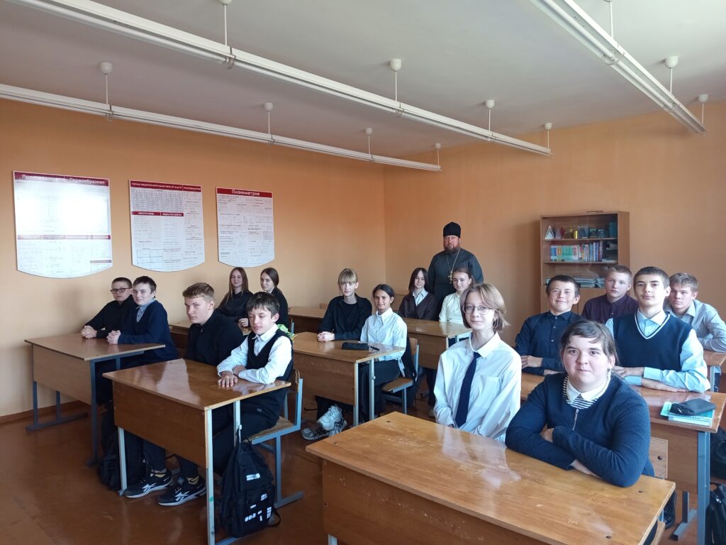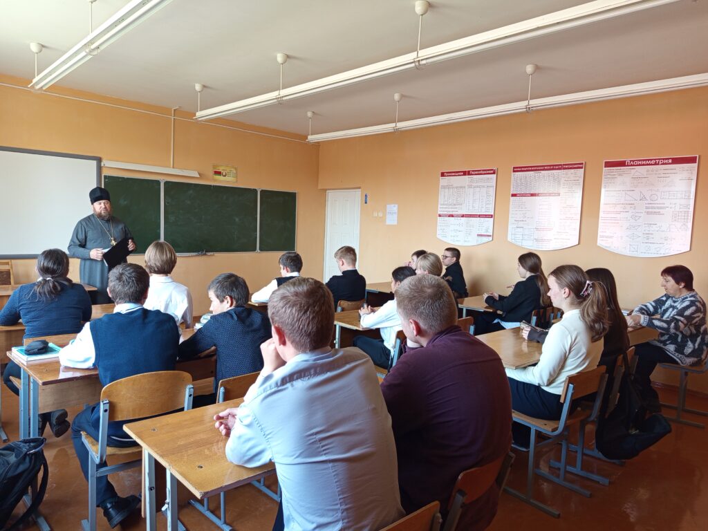 22 октября 2025 г. настоятель храма Успения Пресвятой Богородицы в аг. Липники протоиерей Пётр Джига провёл беседу в ГУО «Липникская СШ им. Н. М. Попова» с учащимися 8 класса на тему: «Слово – дар Божий».