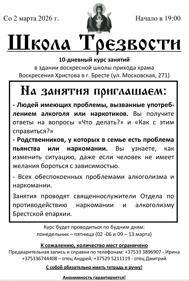 27 января 2026г. в средней школе №1 г. Дрогичина состоялась встреча учащихся 9 «А» класса с клириком храма Сретения Господня в г.Дрогичине иереем Александром Полоско. Тема беседы была посвящена выдающейся личности в истории Беларуси Митрополиту Филарету (Вахромееву), первому Патриаршему Экзарху Продолжить чтение Встреча с учащимися 9 «А» класса в средней школе №1 г.Дрогичина