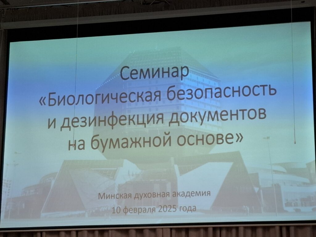 10 февраля 2025 г. на базе Минской духовной академии прошел семинар «Биологическая безопасность и дезинфекция документов на бумажной основе», в ходе которого был рассмотрен вопрос о биологической безопасности фондов. Докладчиками выступили сотрудники Национальной библиотеки Беларуси, которые не только рассказали о дезинфекции книг, но и наглядно продемонстрировали работу в форме мастер-класса. После семинара была проведена экскурсия в церковно-историческом музее при Минской духовной академии. Участие в данном семинаре приняла библиотекарь приходской библиотеки храма Сретения Господня г. Дрогичина Шамич Елена Григорьевна.