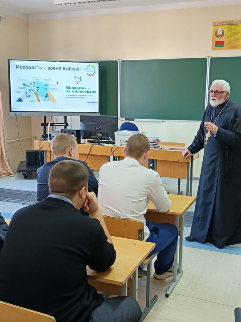 24 октября 2024 г., в рамках проекта ШАГ «Молодость — время выбора. Молодёжь — за милосердие», в Новопопинской средней школе состоялась встреча учащихся с протоиереем Василием Михновцом, настоятелем храма Преображения Господня в аг. Новая Попина.