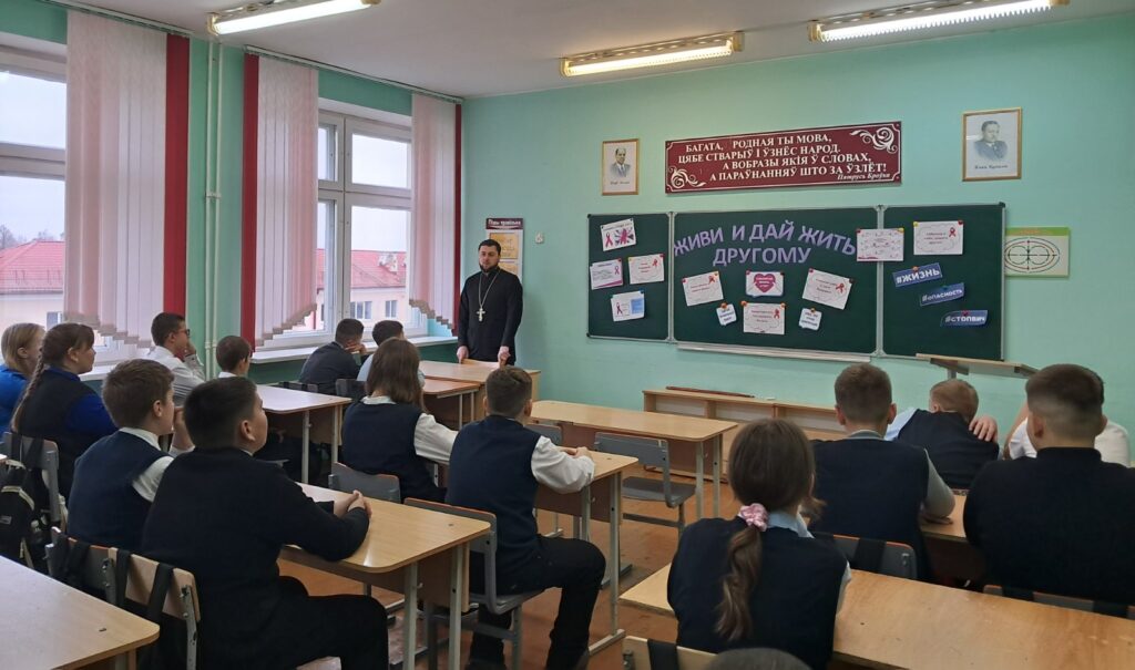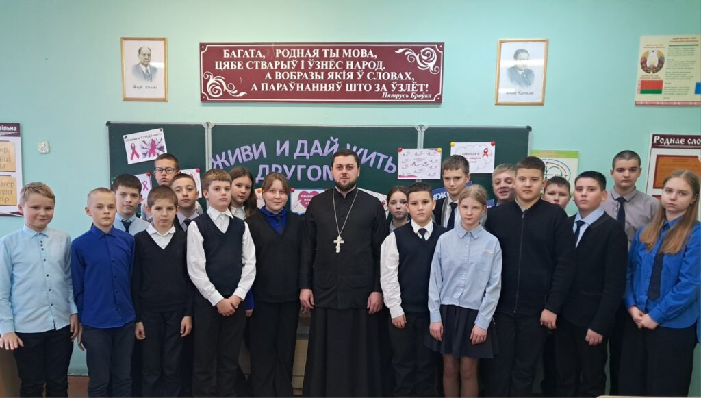 В рамках недели профилактики СПИДа и плана взаимодействия в вопросах воспитания учащихся ГУО «Средняя школа №2 г. Дрогичина» и православного прихода храма преподобной Евфросинии Полоцкой в г. Дрогичине 3 декабря 2024 г. прошел час общения «Живи и дай жить другому» со священником Димитрием Гречко, клириком Евфросиниевского храма. На встрече в качестве слушателей присутствовали ученики 7 класса Второй школы.