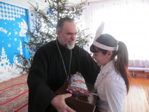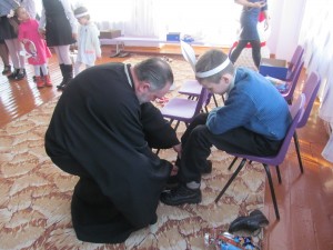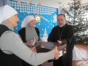 Протоиерей Иоанн Пинчук поздравил всех с праздником. Пожелал здравия, любви, вручил детям сладкие подарки, и каждому ребенку была куплена хорошая и красивая зимняя обувь. Дети с удовольствием ее примеряли и радовались.