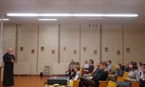 Настоятель храма рассказал присутствующим педагогам и учащимся о значении праздников в жизни православных христиан и о смысле празднуемых событий для всего человечества. На конкретных примерах отец Филипп пояснил, насколько важна вера в жизни человека и что поступки не должны идти вразрез с заповедями Божьими.