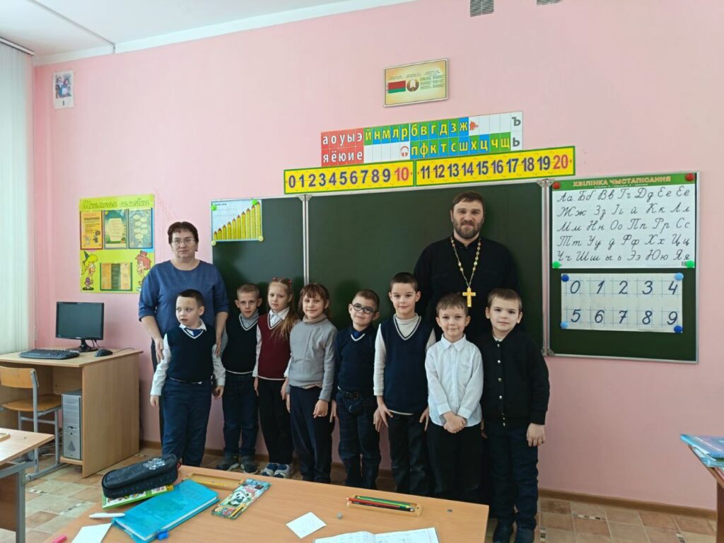 Согласно плану совместных мероприятий прихода храма Покрова Пресвятой Богородицы в аг. Хомск и ГУО «Хомская средняя школа» 3 февраля 2026 г. прошла встреча настоятеля прихода иерея Иоанна Барановского с учащимися 1 класса школы и их учителем Н.В. Губаревич.
