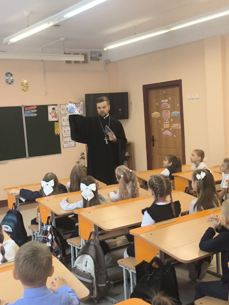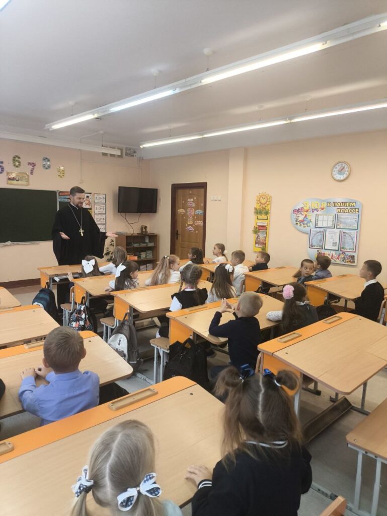 17 сентября 2025 г. в средней школе №1 г. Дрогичина состоялась учащихся 1 «Б» класса с клириком храма Сретения Господня в г. Дрогичине иереем Александром Полоско.