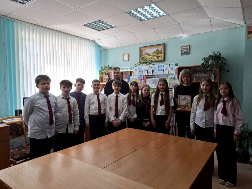 В конце беседы священник Александр Полоско передал в фонд школьной библиотеки комплект детских книг.