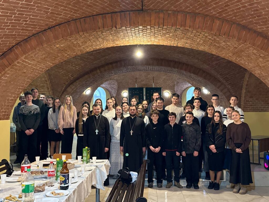 22 февраля 2026 г., в канун Великого поста, на цокольном этаже храма прп. Евфросинии Полоцкой в г. Дрогичине состоялась братская встреча православной молодежи «Два братства, одна Церковь». За общим столом собрались участники братства в честь святых первоверховных апостолов Петра и Павла, действующего при храме преподобной Евфросинии Полоцкой, и братства в честь святителя Нектария Эгинского, действующего при храме Сретения Господня в г. Дрогичине.