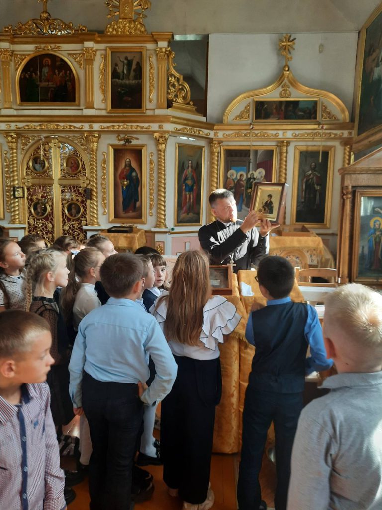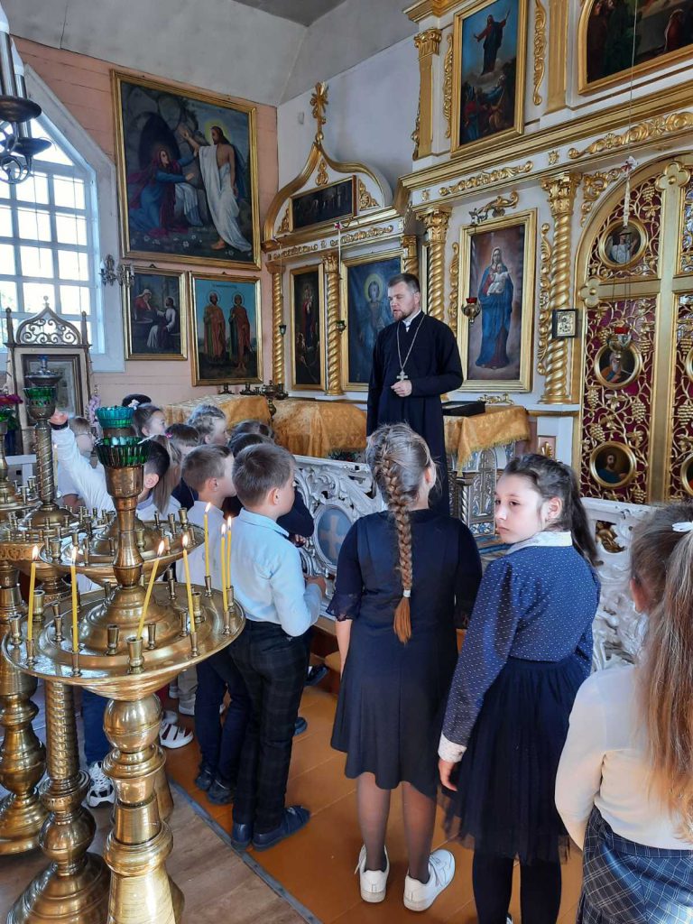27 сентября 2023 г., в праздник Воздвижения Честного и Животворящего Креста Господня, клирик храма Сретения Господня иерей Александр Полоско провел экскурсию по храму для учащихся 3 «А» класса ГУО