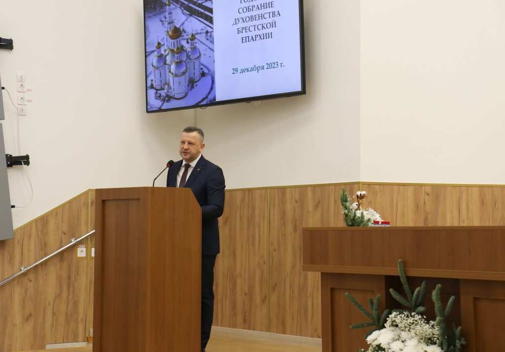 Открыло собрание выступление заместителя председателя областного исполнительного комитета Кравчука Вадима Васильевича. Он отметил высокий уровень взаимодействия Брестской епархии и облисполкома. Также высказал предложения по работе с молодежью в школах. Поблагодарил за приглашение, и поздравил духовенство с наступающими праздниками.