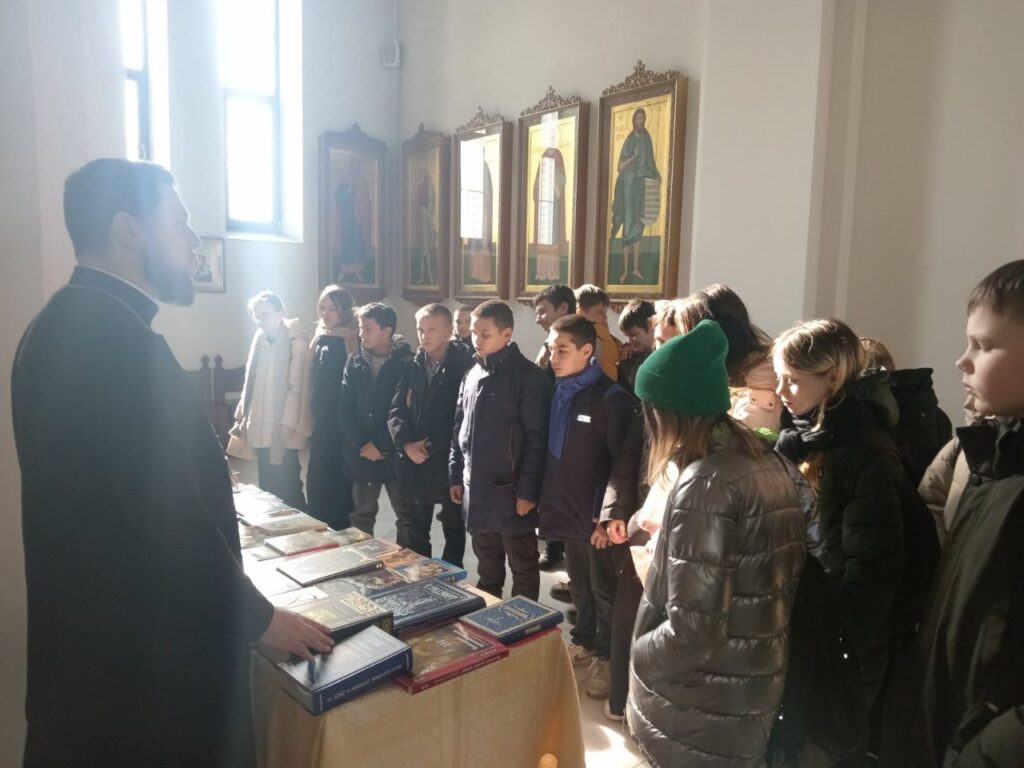 Иерей Димитрий рассказал школьникам о Библии, её содержании и значении для христиан; о богослужебном Апостоле; книгах, содержащих наследие святых отцов и жития святых. Слушатели имели возможность полистать книги, задать вопросы священнику, попробовать чтение на славянском языке.