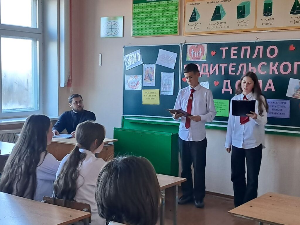 Священнослужитель рассказал о православном христианском взгляде на семью, о том, что сказано в Библии об отношениях и взаимных обязанностях родителей и детей. В завершение своего выступления иерей Димитрий пожелал всем, чтобы родительский дом был всегда местом тепла и поддержки, чтобы в будущем, создавая свою семью, слушатели строили её на фундаменте Закона Божия, тогда семья будет благом для всех её членов.