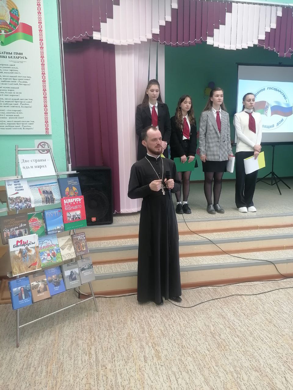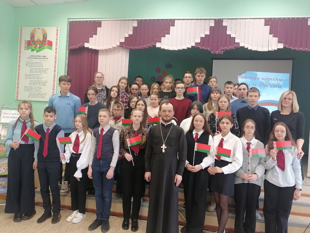 5 апреля 2023 г. в ГУО «Бездежская средняя школа» прошло открытое мероприятие «Две страны – один народ», посвященное Дню единения народов Беларуси и России. В нем принял участие настоятель прихода храма святых Константина и Елены в д. Завершье иерей Александр Зинович.
