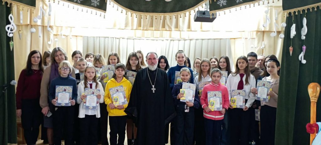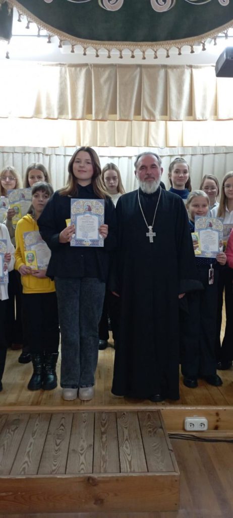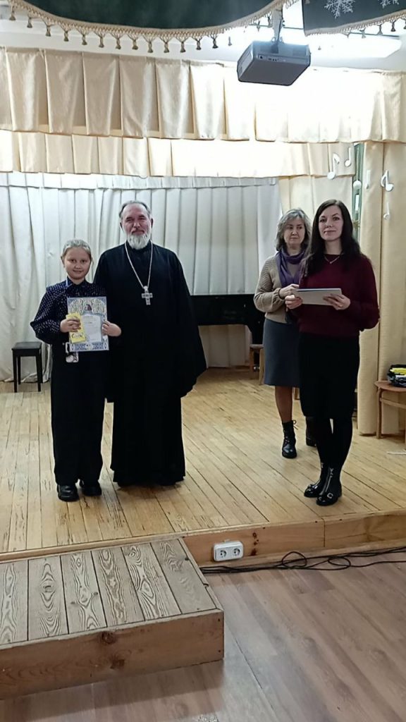 11 января 2024 г. в Актовом зале ГУО «Дрогичинская детская школа искусств» благочинный Дрогичинского церковного округа, настоятель храма преподобной Евфросинии Полоцкой в г. Дрогичине протоиерей Иоанн Пинчук вручил архиерейские грамоты и подарки тем учащимся школы, которые стали участниками Международного конкурса детского творчества «Красота Божьего мира».