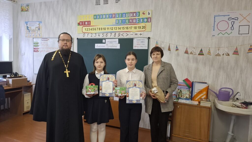 10 января 2025 года в Заречковской средней школе настоятель храма Рождества Пресвятой Богородицы в дер. Ляховичи иерей Сергий Богуш вручил архиерейские грамоты и сладкие угощения детям, которые участвовали в Международном конкурсе детского творчества «Красота Божьего мира».