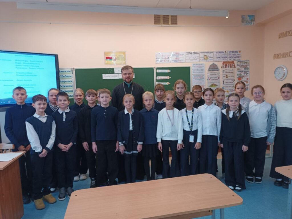 12 ноября 2025 г. в средней школе №1 г. Дрогичина прошла встреча учащихся 4 «Б» класса с клириком храма Сретения Господня в г. Дрогичине иереем Александром Полоско.