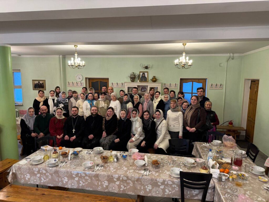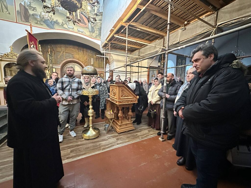 До поездки оставалось целых два месяца, но они прошли быстро, и вот настало 8-е февраля. 42 человека на красивом комфортабельном автобусе отправились в паломническую поездку. Путь не близкий, но с Божьего благословения, пять часов в дороге пролетели незаметно. И вот мы в Гомеле, автобус плавно припарковался у ворот Свято-Никольского храма, расположенного на территории Свято-Никольского мужского монастыря. На улице зима, но радушный и теплый приём служителями монастыря не позволил нам замёрзнуть. Нас сразу пригласили в трапезную, угостили простым, но невероятно вкусным обедом. Архимандрит Савва (Мажуко) нас уже ждал, и общение началось прямо во время обеда. Первое впечатление о священнике – простой, добрый, с чувством юмора, человек. Подкрепившись, мы организованно проследовали за архимандритом в Свято-Никольский храм, где он нам поведал не простую, но интереснейшую историю храма.