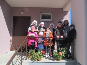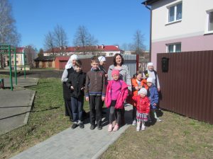Дети вместе с приемной мамой встретили нас во дворе дома. Погода была солнечная, теплая и сестры милосердия вместе погуляли с ними. Детям всем была куплена новая обувь к весеннему сезону.