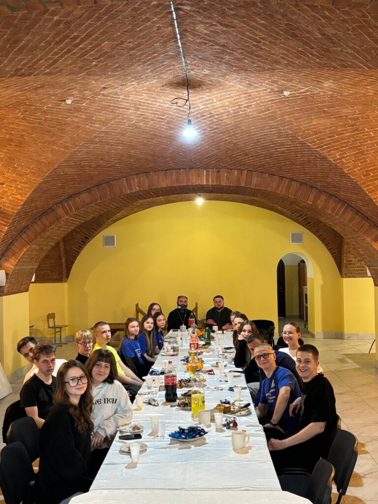 Пасхальная встреча началась с общей молитвы. Далее за трапезой молодые христиане играли в игры на знакомство, общались друг с другом, рассказывали о деятельности молодежных объединений, делились планами.