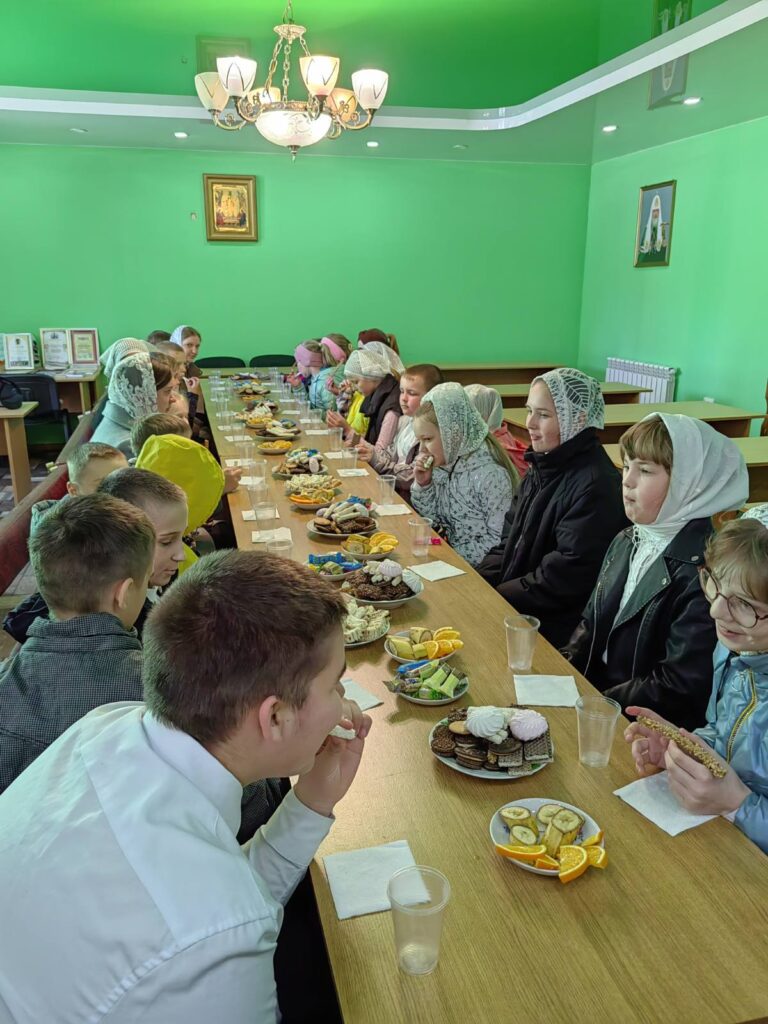 Радушно встречал гостей настоятель храма Святой Живоначальной Троицы в аг. Бездеж протоиерей Геннадий Ворон. После молебна учащиеся воскресной школы храма святителя Николая Чудотворца в аг. Закозель поздравили настоятеля и прихожан храма Святой Живоначальной Троицы в аг. Бездеж с праздником Светлой Пасхи. Дети рассказывали стихотворения и пели песни, прославляя Воскресшего Христа. Затем иерей Сергий Остапович поздравил всех с великим праздником ПАСХИ. Далее в воскресной школе была организована трапеза, где учащиеся обеих воскресных школ смогли познакомится и пообщаться поближе в неформальной обстановке.