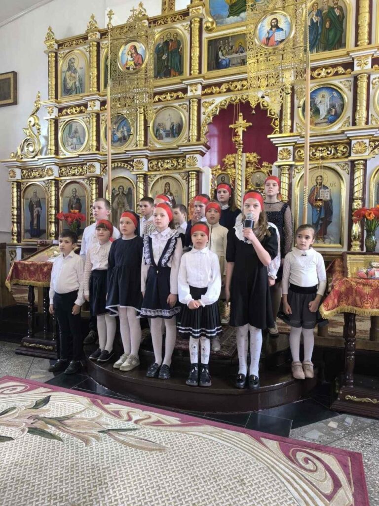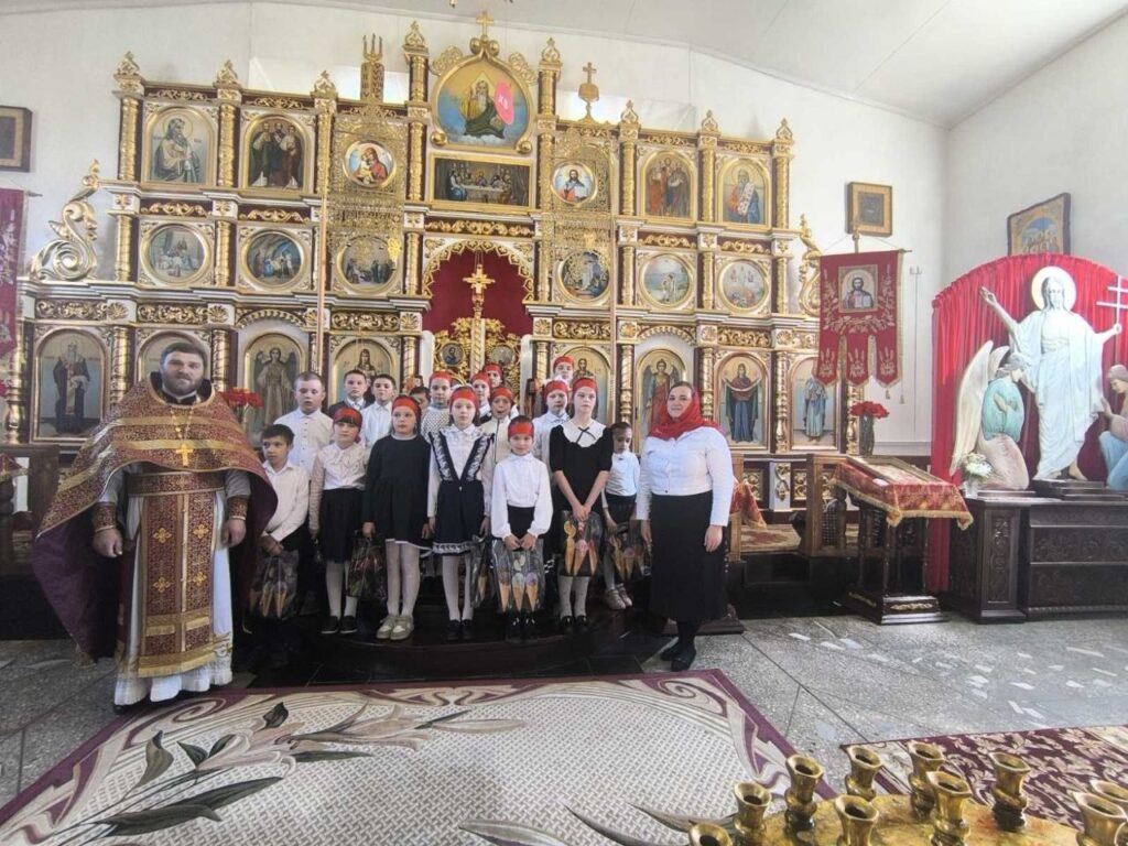 26 апреля 2026 г., в Неделю Жен-мироносиц, после Божественной Литургии воспитанники Воскресной школы прихода храма Покрова Пресвятой Богородицы в аг. Хомск под руководством преподавателя Т.П. Барановской поздравили прихожан с главным праздником — Воскресением Христовым, а также с днём Святых Жен-мироносиц.