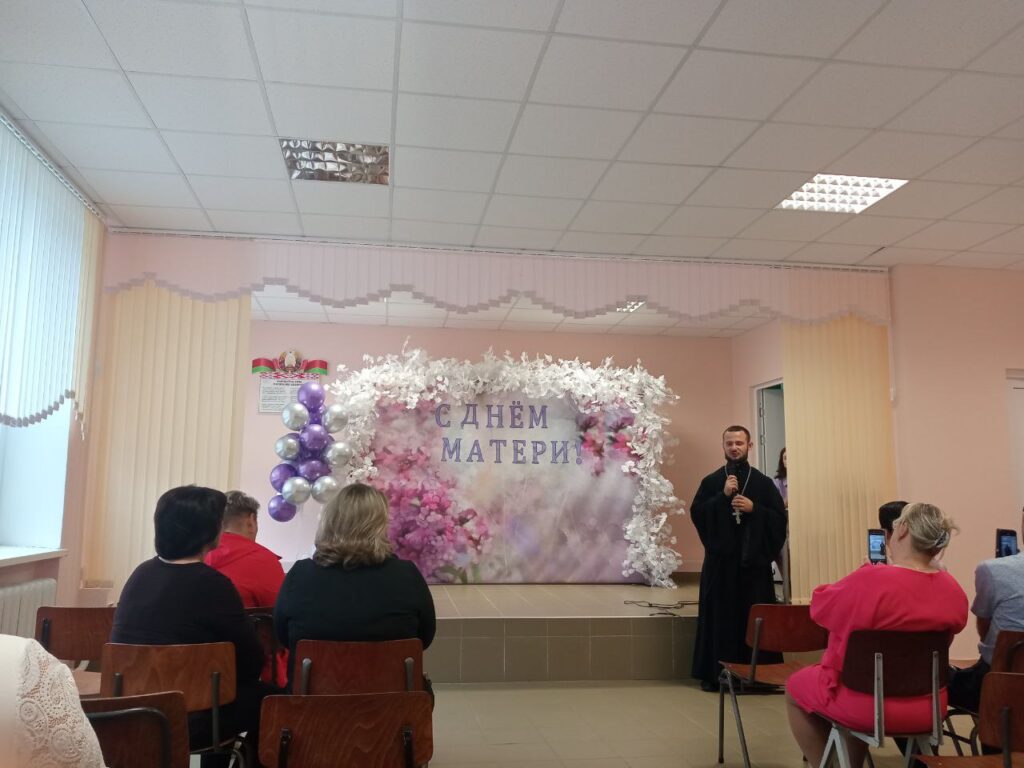 Священник поздравил присутствующих с праздниками Покрова Пресвятой Богородицы и Днем матери, которые в Беларуси празднуются в один день. В своем слове священнослужитель акцентировал внимание на Божией Матери, как примере подлинного материнства.