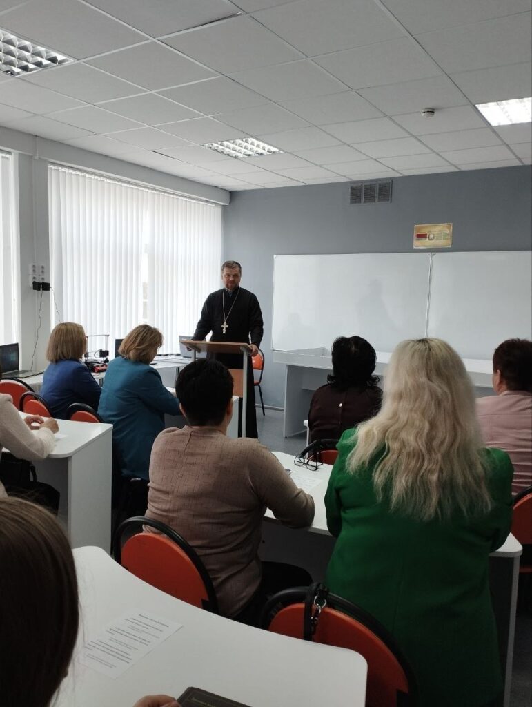 17 апреля 2026 г. в средней школе №1 г. Дрогичина состоялось методическое объединение педагогов района в рамках инновационного проекта по духовно-нравственному воспитанию. Педагоги собрались на семинаре-практикуме ресурсного центра на тему: «Формирование духовных, морально-нравственных качеств и патриотического духа учащихся через изучение православной культуры, традиций белорусского народа и истории малой Родины». В работе семинара принял участие клирик храма Сретения Господня в г. Дрогичине иерей Александр Полоско. Священник выступил перед педагогами с докладом, в котором поделился опытом работы в данном направлении в рамках сотрудничества прихода храма Сретения Господня и средней школы №1.