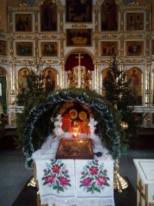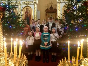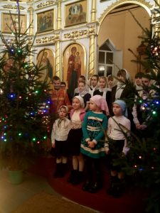 На Рождественскую службу, по благословению настоятеля храма дер. Завершье святых равноапостольных царя Константина и Елены, иерея Александра Зиновича по окончании Божественной Литургии поздравили прихожан храма воспитанники воскресной школы.