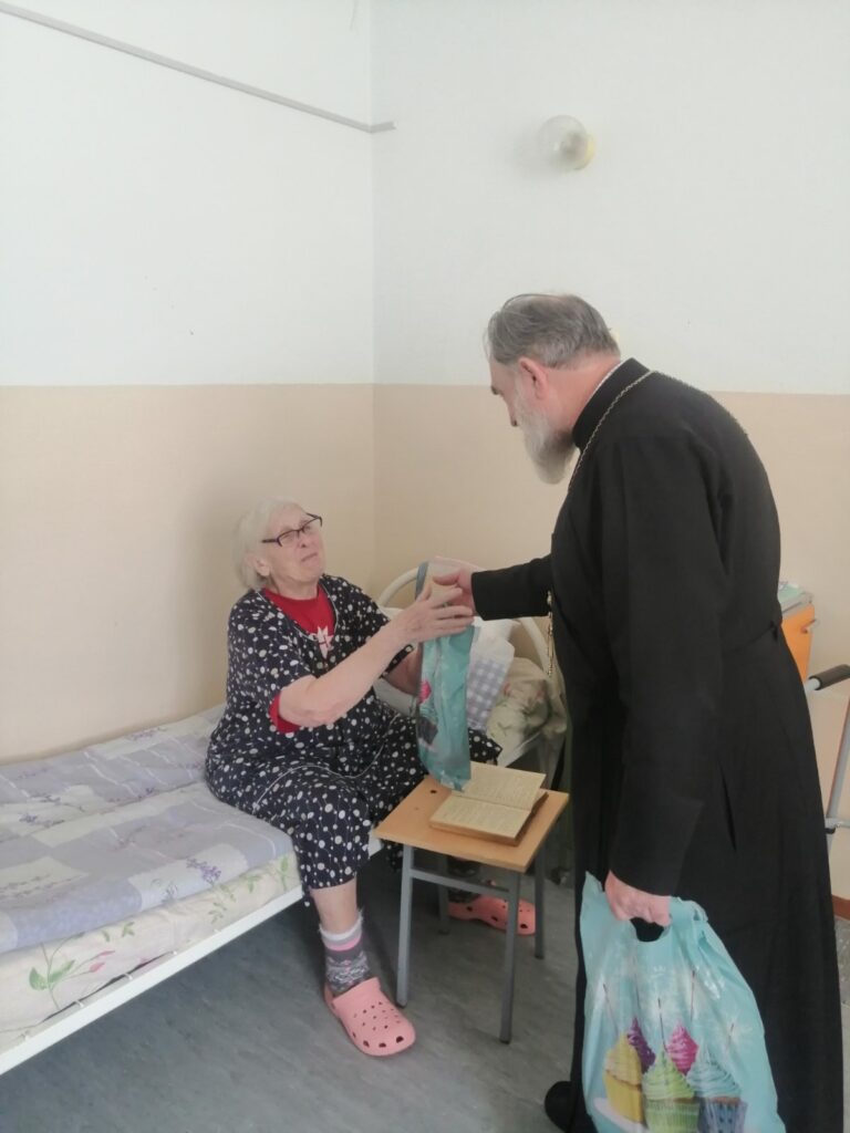 Обходя палаты, священники старались уделять внимание каждому пациенту, проживающему на социальной койке: выслушивали и поддерживали добрыми словами, при необходимости утешали. Затем отец Иоанн поздравил всех со светлым праздником Воскресения Христова и пожелал всем телесного здравия, пасхальной радости, терпения и мира в душе, вручил пасхальные подарки — сладости и средства личной гигиены, собранные прихожанами Евфросиниевского храма в ходе традиционной Пасхальной акции «Твори добро.»