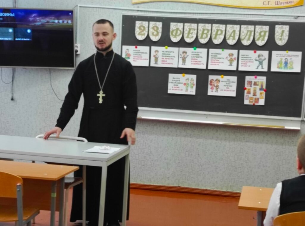 23 февраля 2026 года в ГУО «Средняя школа д. Воловель» состоялись встреча настоятеля храма святого великомученика Георгия Победоносца в дер.Воловель иерея Сергия Остаповича с учащимися 5-6 классов на тему: «Святость. Святые воины». В ходе беседы священник рассказал о том, что такое святость, кто такие святые, за что воины и полководцы были прославлены Церковью в лике святых.