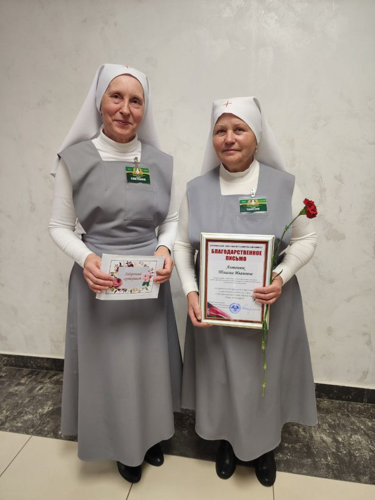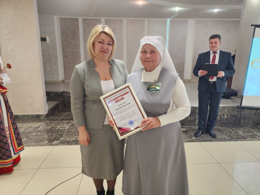Благодарственное письмо районного исполнительного комитета за проявленные гуманизм и милосердие в отношении к людям Татьяна Масюк вручила Таисии Антонюк, сестре милосердия сестричества в честь святой преподобномученицы Великой княгини Елисаветы.