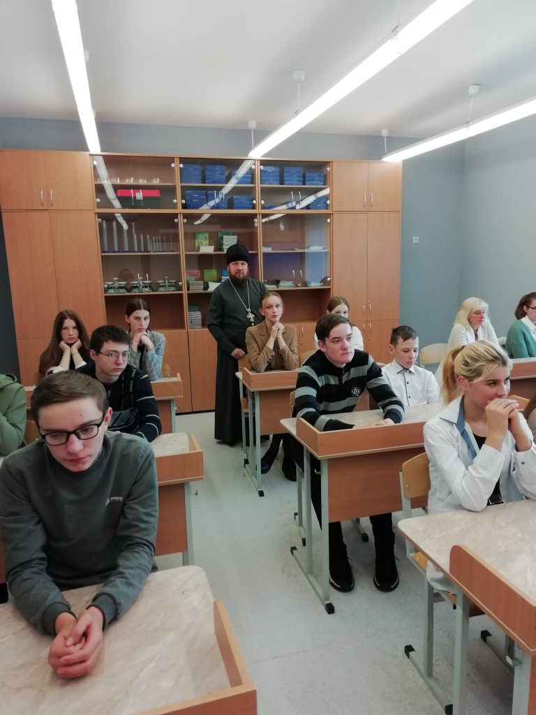 Богородицы в аг. Липники протоиерей Пётр Джига продолжил беседу совместно с руководителем по военно-патриотическому воспитанию Громик Алесей Мечиславовной с учащимися 9 и 10 классов на тему: «Почитай отца твоего и матерь твою».
