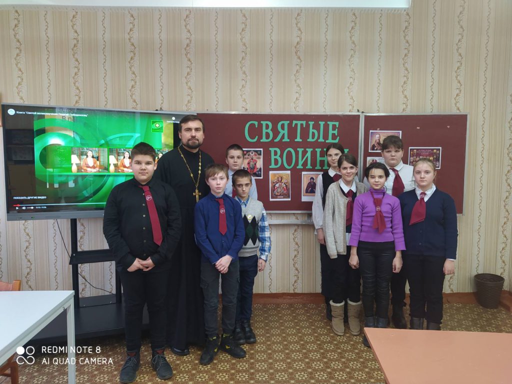 В ходе встречи учащиеся посмотрели два фильма о жизни и подвигах святого благоверного князя Александра Невского и святого великомученика Георгия Победоносца. Разобрали качества, которыми обладали эти святые. Вместе пришли к выводу, что для того, чтобы быть полезным своей Родине нужно помнить историю и воспитывать в себе качества, которыми обладали святые воины.