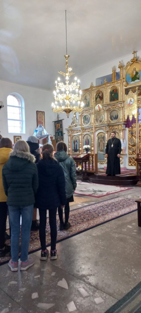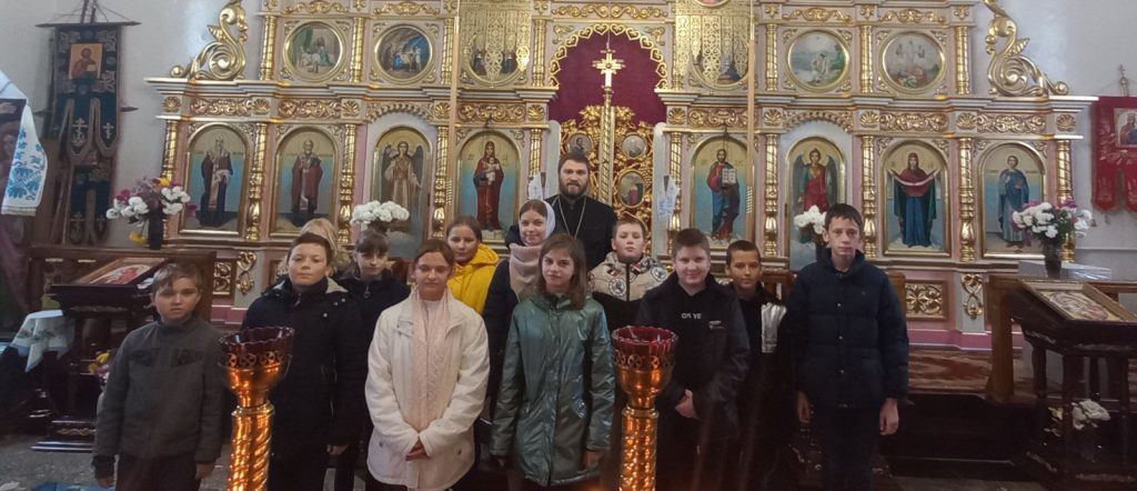 2 ноября 2022 г. в храме Покрова Пресвятой Богородицы агрогородка Хомск состоялась экскурсия для учеников 7-го класса ГУО «Хомская средняя школа». Настоятель прихода иерей Иоанн Барановский рассказал детям историю храма, о его устройстве. Объяснил значение регулярного посещения храма и совместной молитвы для христиан, рассказал о правилах поведения в храме.