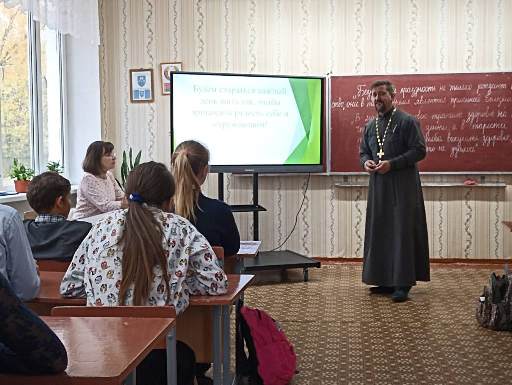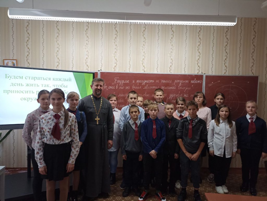 24 октября 2022 года в Воловельской средней школе настоятель храма святого великомученика Георгия Победоносца в дер. Воловель иерей Сергий Немшон обратился со словом назидания к ученикам 6-8 классов на тему: «Грех как следствие духовной и физической смерти».