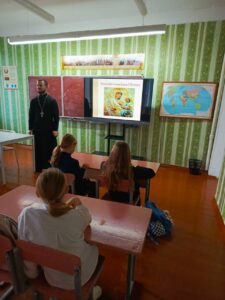21 ноября 2024 года в Воловельской СШ прошла встреча настоятеля храма святого великомученика Георгия Победоносца в д. Воловель иерея Сергия Остаповича с учениками 6-7 классов. Иерей Сергий рассказал слушателям о празднике Архистратига Михаила и иконы Божией Матери «Скоропослушница».