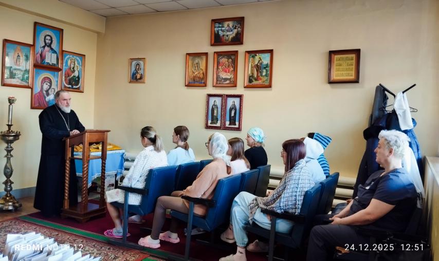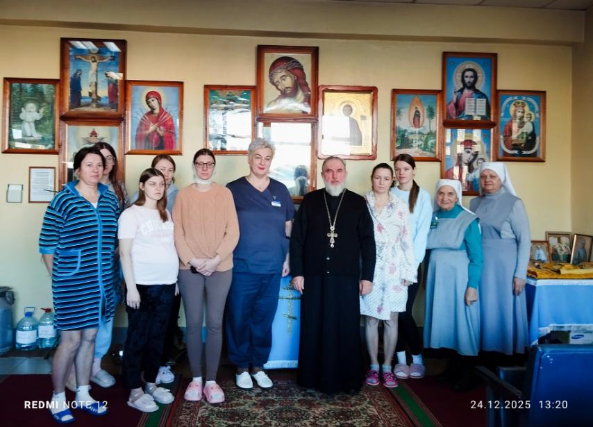 24 декабря 2025 года прошла очередная встреча настоятеля прихода храма преподобной Евфросинии Полоцкой в городе Дрогичине протоиерея Иоанна Пинчука и сестёр сестричества милосердия, действующего при храме, с беременными женщинами родильного отделения и женщинами хирургического отделения (гинекологические койки), находящимися на стационарном лечении в ЦРБ.