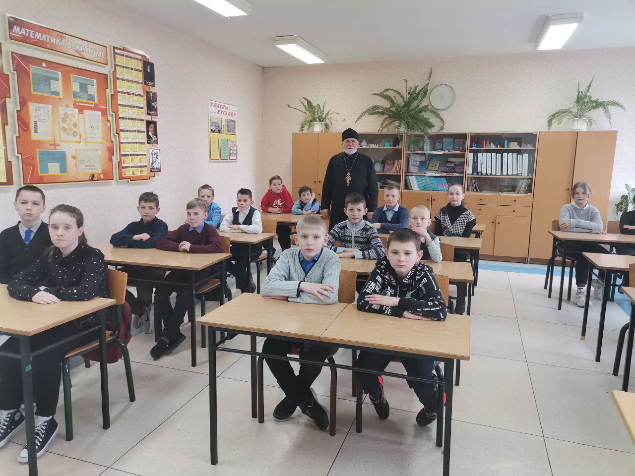 Дети внимательно слушали рассказ батюшки и задавали вопросы. Состоялась содержательная беседа, в ходе которой отец Василий на примере жизни святых рассказал о глубокой вере, освящающей их жизненный подвиг, и очень доступно объяснил детям значение веры в жизни современного человека, пожелал, чтобы поступки школьников согласовывались с Божьими заповедями.