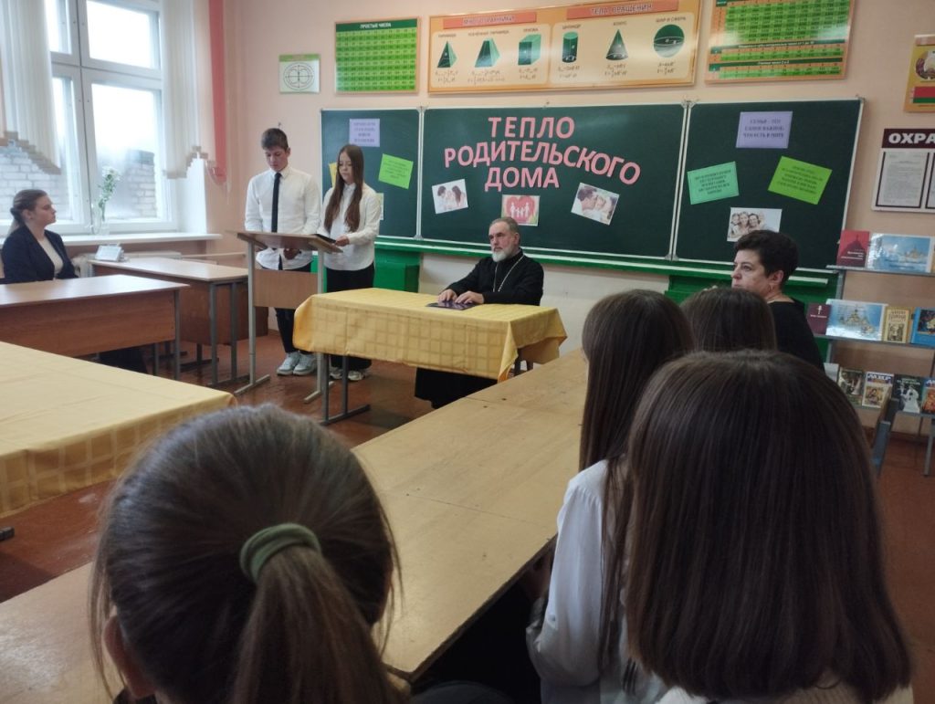 Отец Иоанн рассказал старшеклассникам о том, что такое семья с православной точки зрения, какие в семье должны быть отношения, чтобы она была крепкой; об обязанностях родителей и детей по отношению друг другу с точки зрения Закона Божия.
