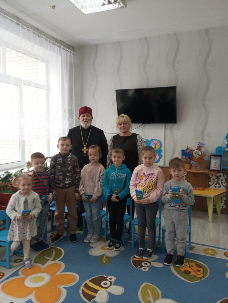 Батюшка увлекательно поведал детишкам библейскую историю о сотворении мира на примерах природы – солнца, птиц, животных и растений. А также пояснил, почему важно быть добрым и помогать другим. Отметил с радостью, что дети регулярно посещают храм и принимают Святое Причастие. В заключение батюшка порадовал малышей сладкими подарками.