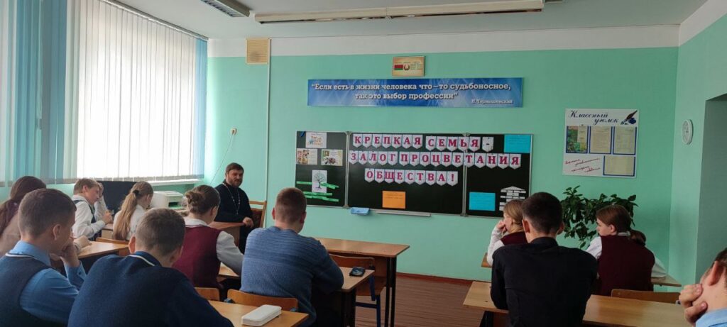 Беседа прошла с учениками 9-10 классов на тему «Международный День семьи». Священник Иоанн отметил, что главное в семейной жизни — это любовь, именно на ней строится крепкая, дружная семья.