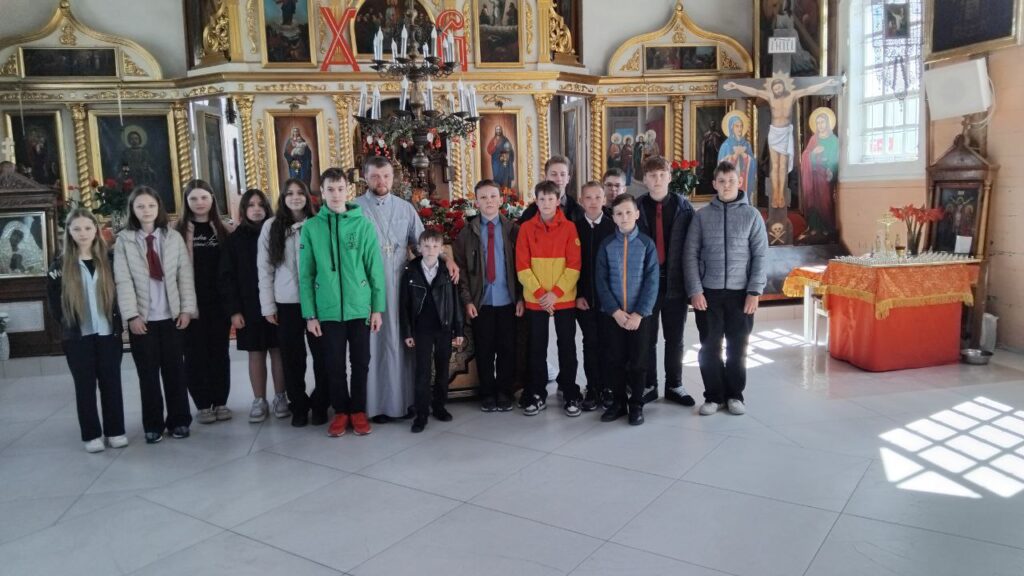 В рамках реализации мероприятий плана взаимодействия средней школы №1 г. Дрогичина и прихода храма Сретения Господня в г. Дрогичине 26 апреля 2025 г. в храме Сретения Господня состоялась пасхальная встреча учащихся 7 классов с клириком храма иереем Александром Полоско.