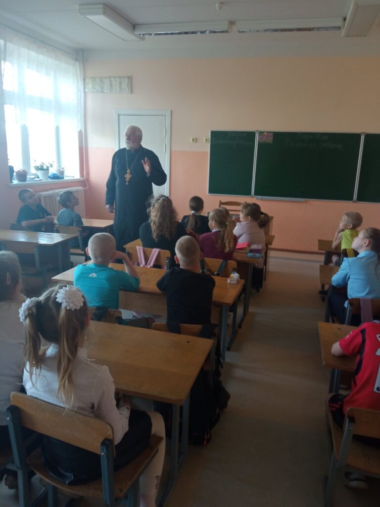 30 апреля 2025 г. состоялась духовно-нравственная беседа настоятеля храма Преображения Господня в аг. Новая Попина протоиерея Василия Михновца с учащимися 1-4 классов Новопопинской средней школы. Отец Василий говорил с учащимися о трудолюбии как добродетели и лености как опасном грехе.