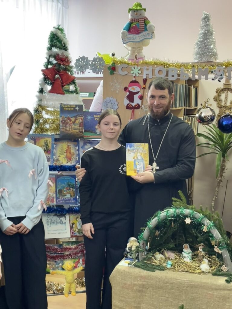 4 января 2026 года настоятель храма Покрова Пресвятой Богородицы в аг. Радостово иерей Леонид Коледа вместе с воспитанниками воскресной школы и педагогом Кравчук Александрой Михайловной посетили сельскую библиотеку.