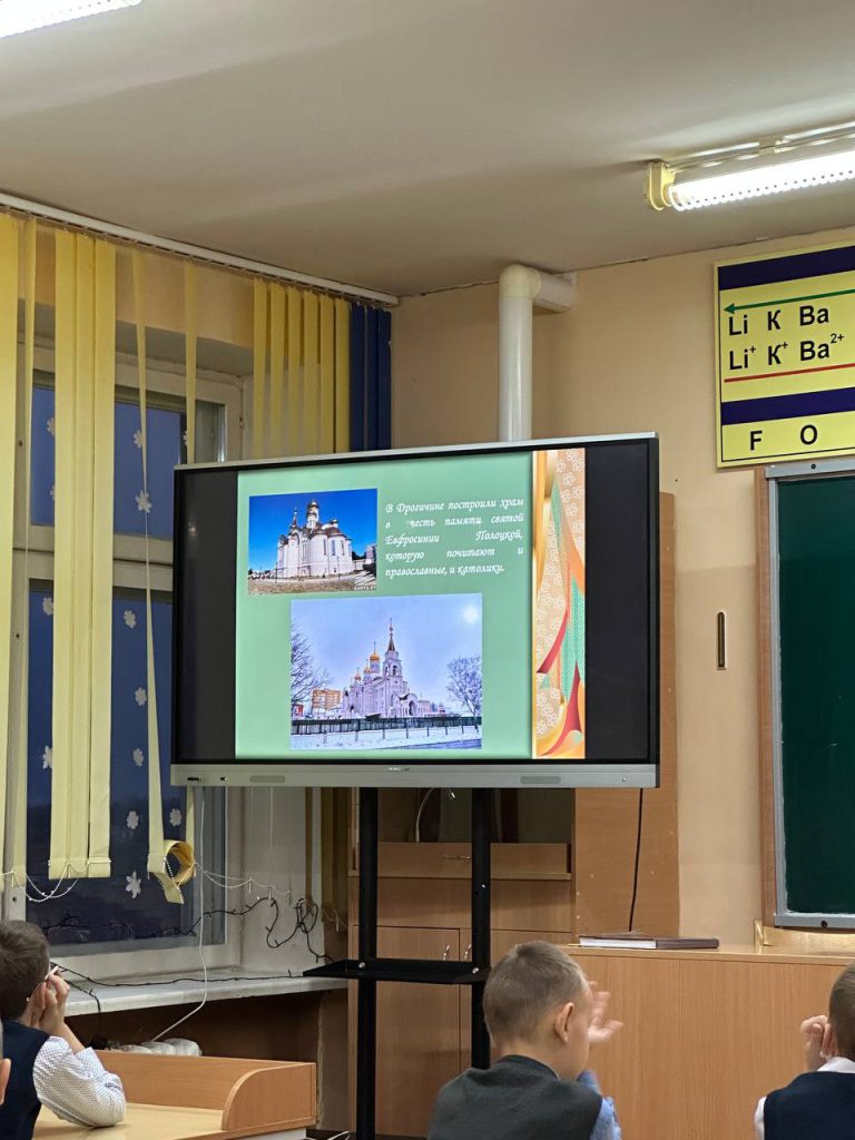 20 декабря 2023 г. в ГУО «Гимназия г. Дрогичина» в 6-м классе и в ГУО «Средняя школа №2 г. Дрогичина» в 5 классе прошли уроки, посвященные 850-летию преставления преподобной Евфросинии Полоцкой.